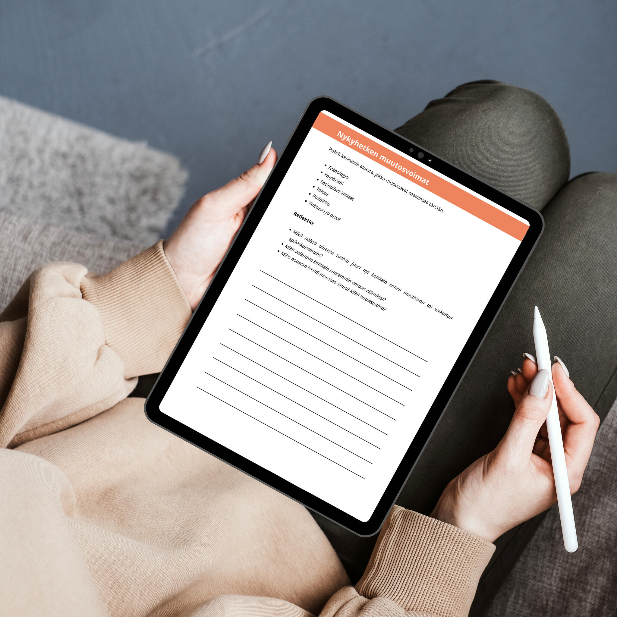 Avaa PDF esimerkiksi Goodnotesissa, Notabilityssa tai missä tahansa PDF-editorissa. Erityisen hyvin toimii erilaisilla tableteilla/pädeillä stylus-kynän kanssa.Erillisiä työkaluja ei tarvita – vain rauhallinen hetki, ripaus uteliaisuutta ja tila reflektoida.Aloita omaan tahtiisi. Palaa työkirjaan aina, kun koet siihen tarvetta.